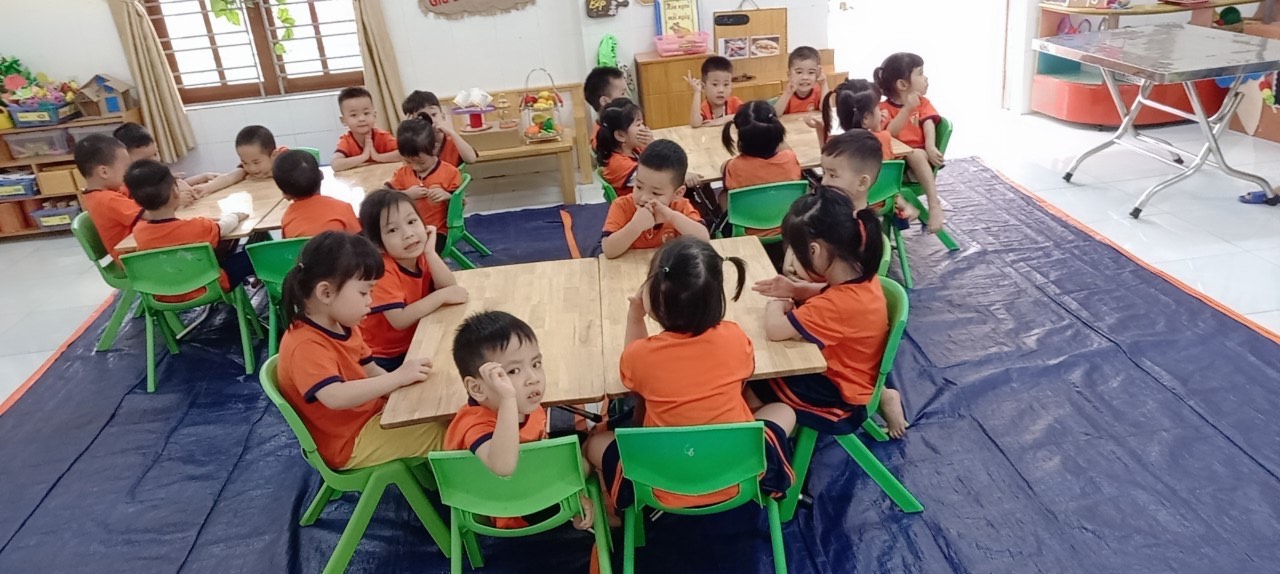 Các bé đang ngồi vào bàn ăn để chuẩn bị rửa tay, rửa mặt .