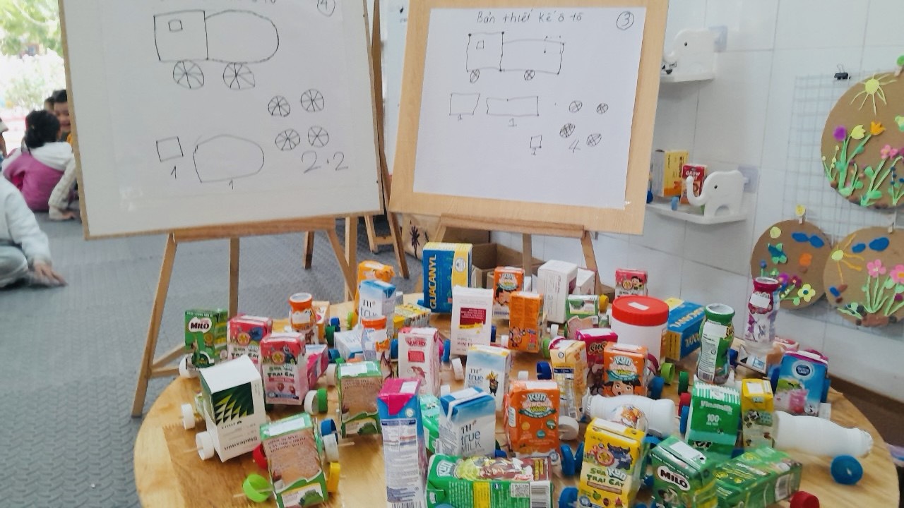 Thực hiện chương trình “ An toàn giao thông “ Lớp 5A1. Trường mầm non Ngũ Lão đã thực hiện hoạt động trải nghiệm “ Làm ô tô từ vỏ sữa và nắp chai”