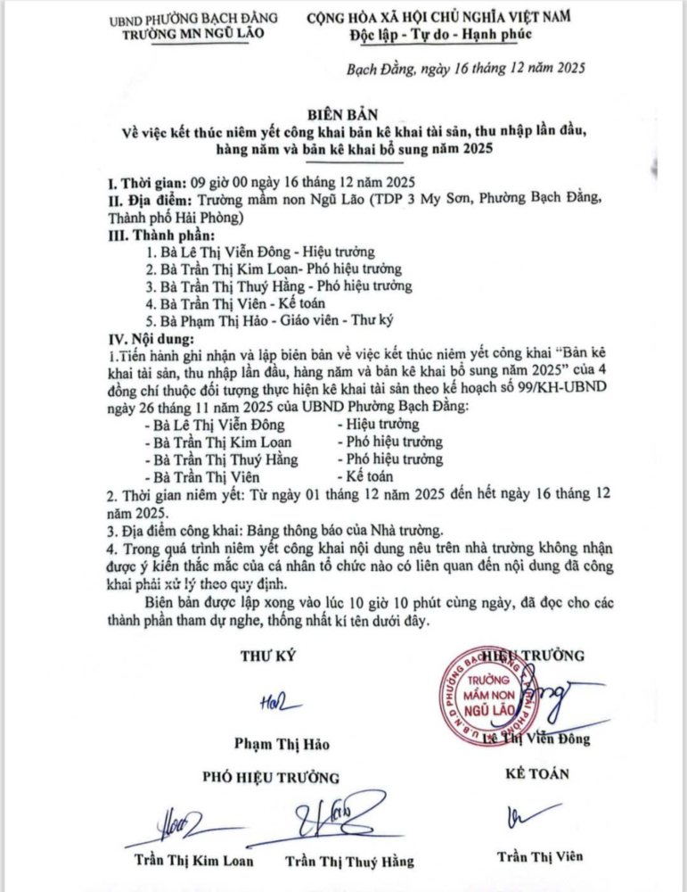 Ngày 16/12/2025, Trường Mầm non Ngũ Lão đã tiến hành lập Biên bản kết thúc niêm yết công khai đối với bản kê khai tài sản, thu nhập năm 2025 của các đồng chí trong diện kê khai theo quy định. Biên bản được thông qua, thống nhất và ký xác nhận bởi các thành phần tham dự.