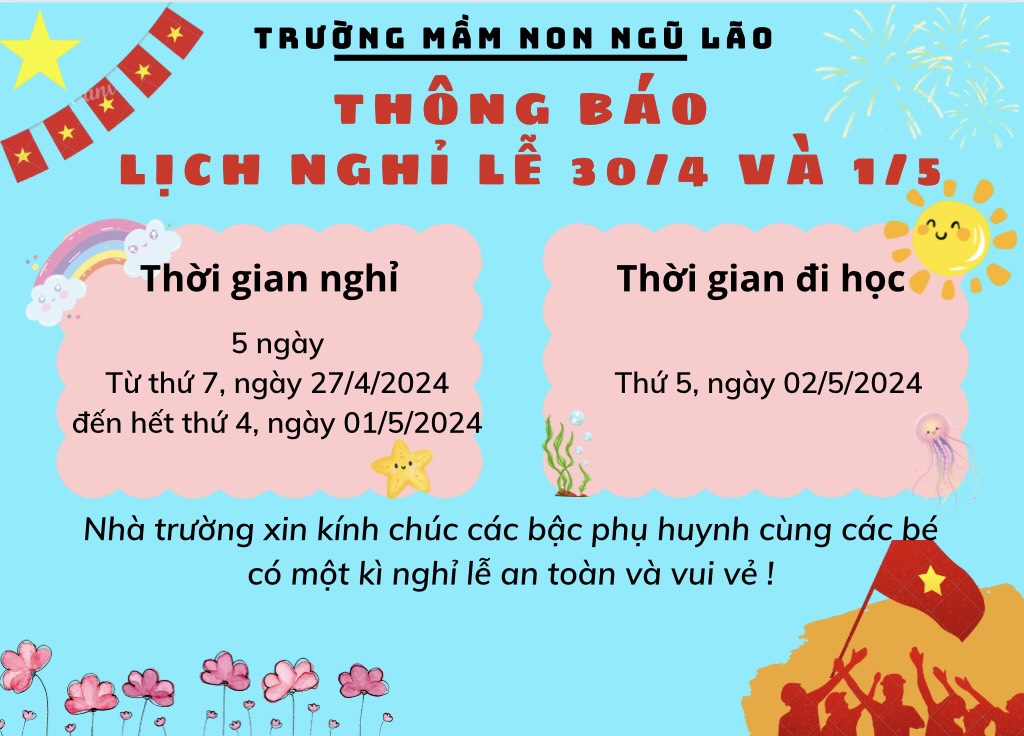 Trường Mầm non Ngũ Lão xin trân trọng thông báo tới các bậc phụ huynh lịch nghỉ lễ ngày Chiến thắng 30/4 và Quốc tế lao động 1/5.