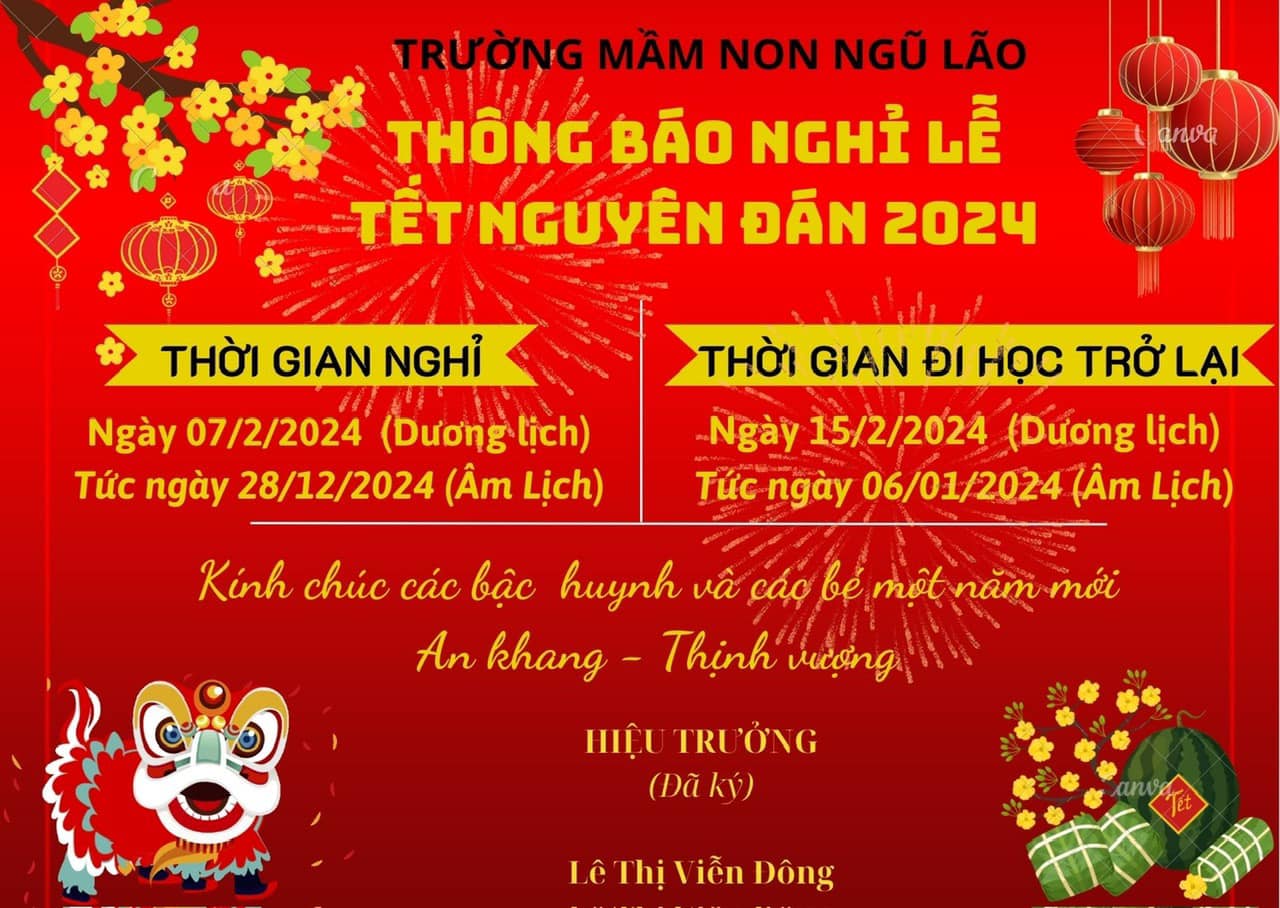 Trường Mầm non Ngũ Lão trân trọng gửi tới các bậc phụ huynh lịch nghỉ tết Nguyên đán 2024 từ ngày 07/2/2024 đến hết ngày 14/2/2024. Kính chúc các bậc phụ huynh cùng các bé một năm mới An khang - Thịnh vượng!