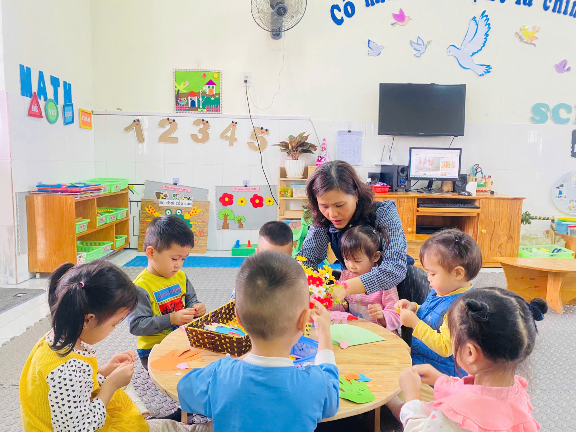 Cô đến từng nhóm để giúp đỡ trẻ hoàn thiện bài và tạo ra những chiếc bưu thiếp đẹp và sáng tạo.