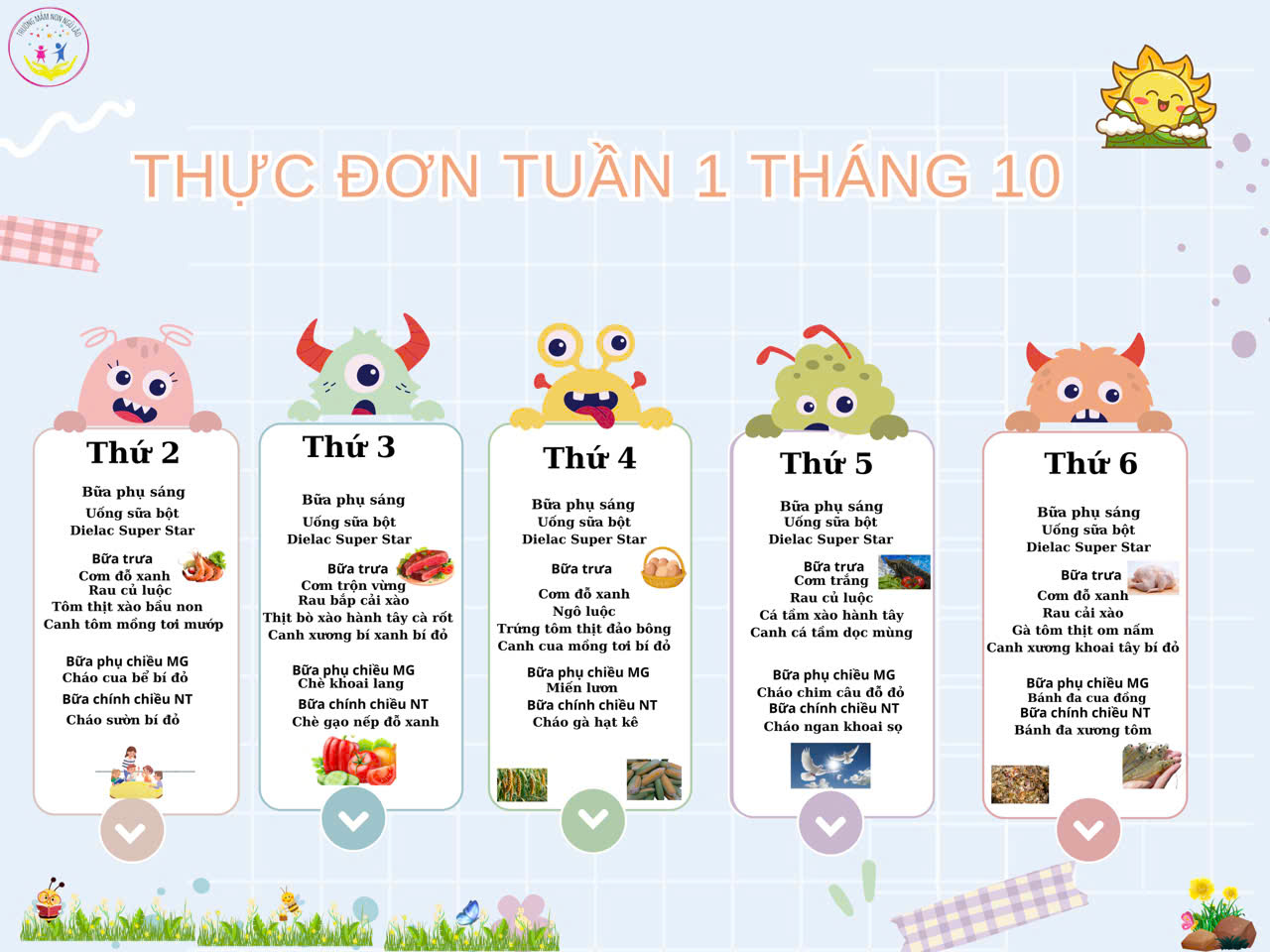 Đây là thực đơn tuần 1 tháng 10 của trường mầm non Ngũ Lão. Ba mẹ hãy cùng với các cô nuôi nấu những bữa cơm thật ngon, thật mới lạ cho các con của mình nhé!