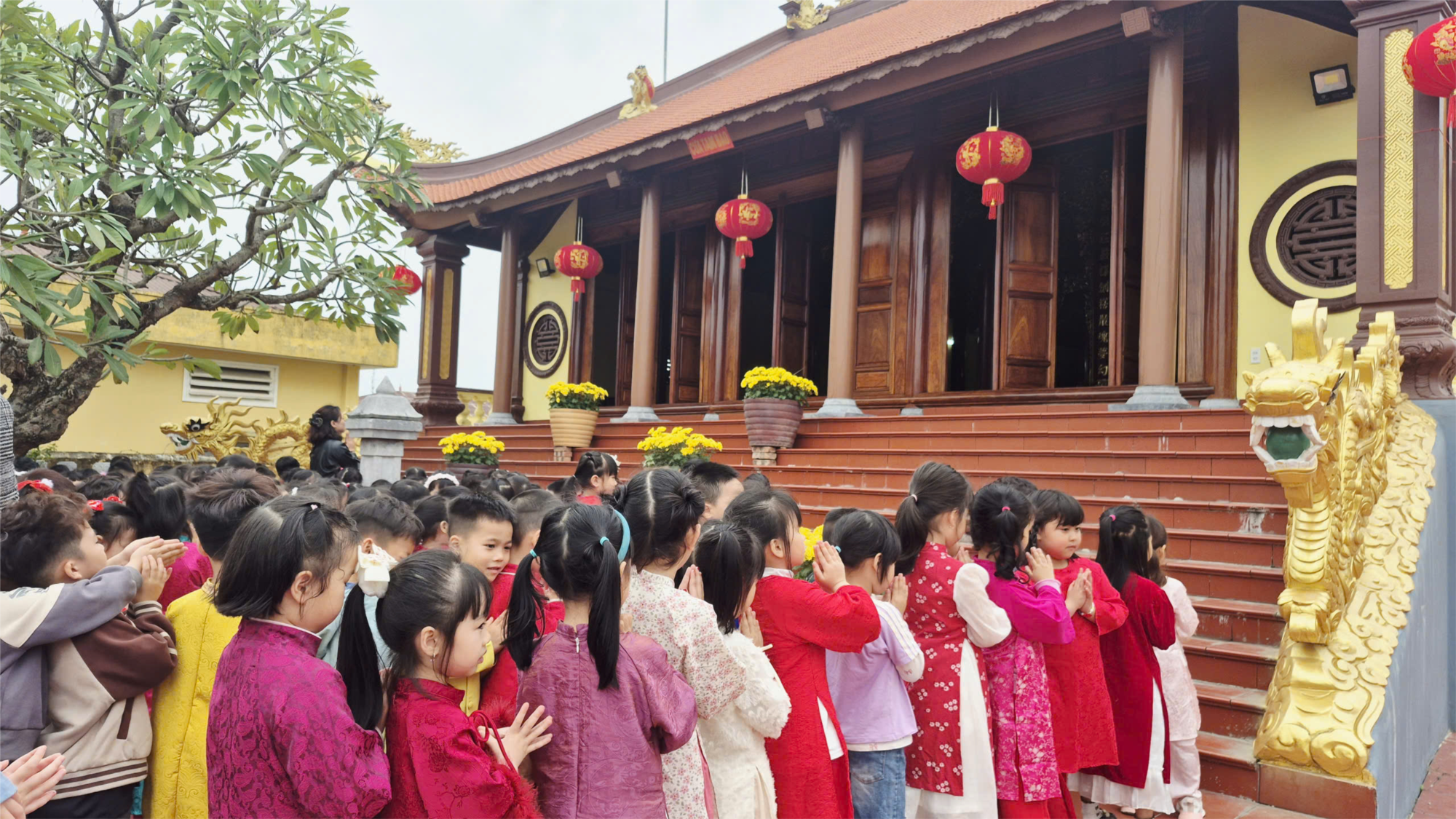 Trong tà áo dài truyền thống, các con xếp hàng ngay ngắn, giữ thái độ nghiêm trang khi vào chùa, thành kính dâng hương lễ Phật. Dưới sự hướng dẫn tận tình của các cô giáo, mỗi hành động nhỏ như chắp tay, cúi đầu, đi nhẹ – nói khẽ đều trở thành những bài học thực tế về lễ nghi, sự tôn kính và lòng biết ơn.
