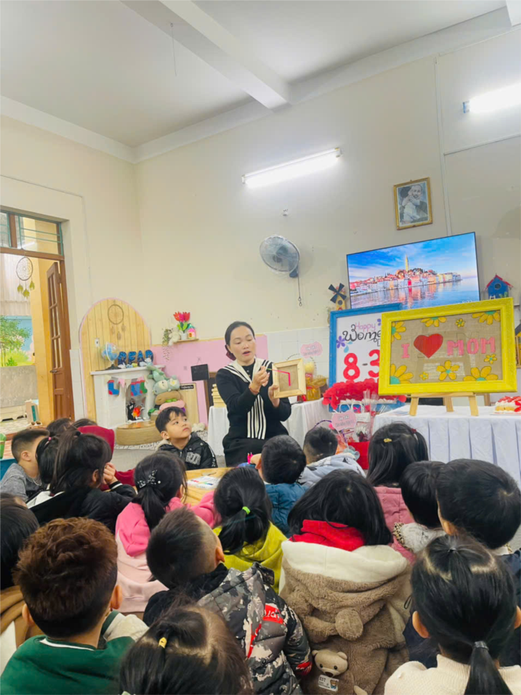 Ngay từ sáng, các bé đã chăm chú lắng nghe cô giáo hướng dẫn cách xâu kim, luồn len qua những lỗ nhỏ trên khung để tạo thành những bức tranh xinh xắn hình bông hoa, trái tim . Đôi bàn tay nhỏ nhắn, đôi lúc còn vụng về, nhưng bé nào cũng cố gắng kiên nhẫn, tỉ mỉ từng mũi thêu để hoàn thành món quà ý nghĩa dành tặng mẹ. Khi sản phẩm hoàn thành, bé còn trang trí thêm sticker, vẽ hình và viết những lời chúc yêu thương gửi đến mẹ thân yêu. Nhìn những gương mặt rạng rỡ, tràn đầy tự hào khi nâng niu bức tranh do chính mình làm ra, cô giáo càng thêm xúc động. Hoạt động không chỉ giúp bé rèn luyện sự khéo léo, kiên nhẫn mà còn vun đắp tình yêu thương dành cho mẹ, giúp bé hiểu rằng, một món quà đơn giản nhưng chứa đựng tấm lòng mới là điều quý giá nhất.