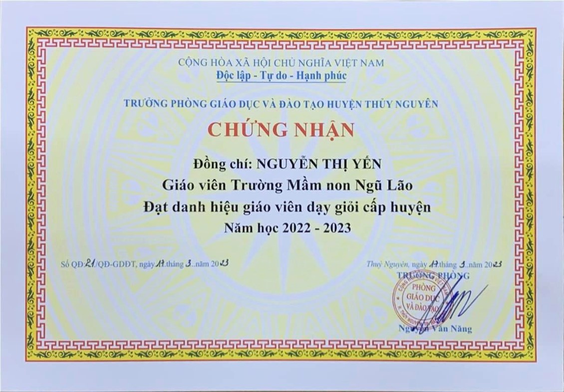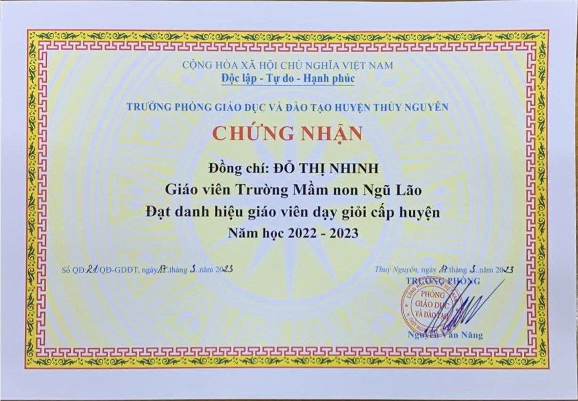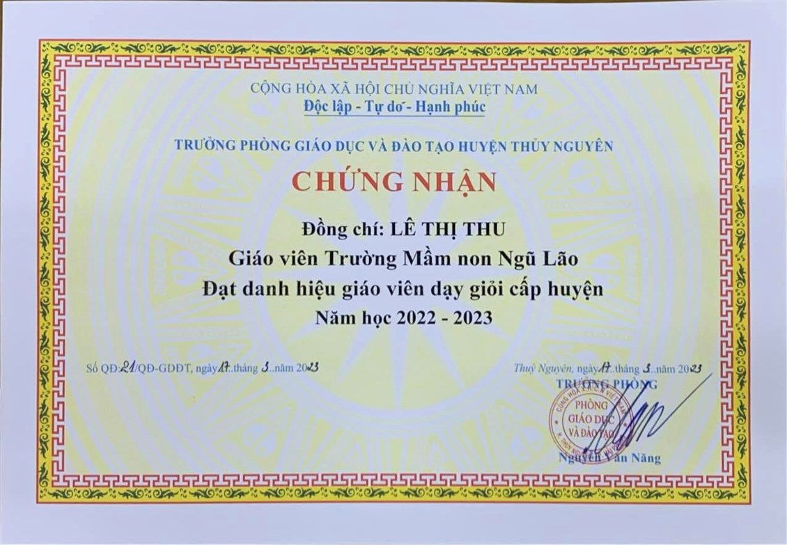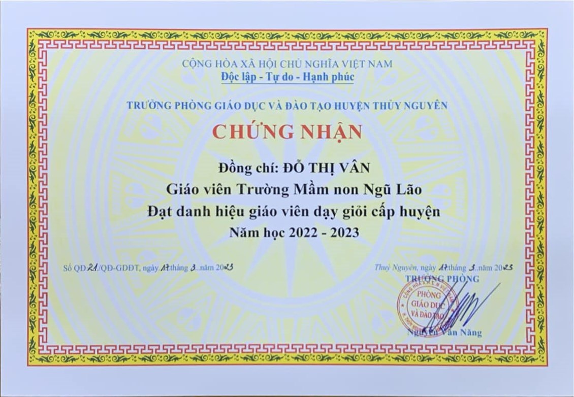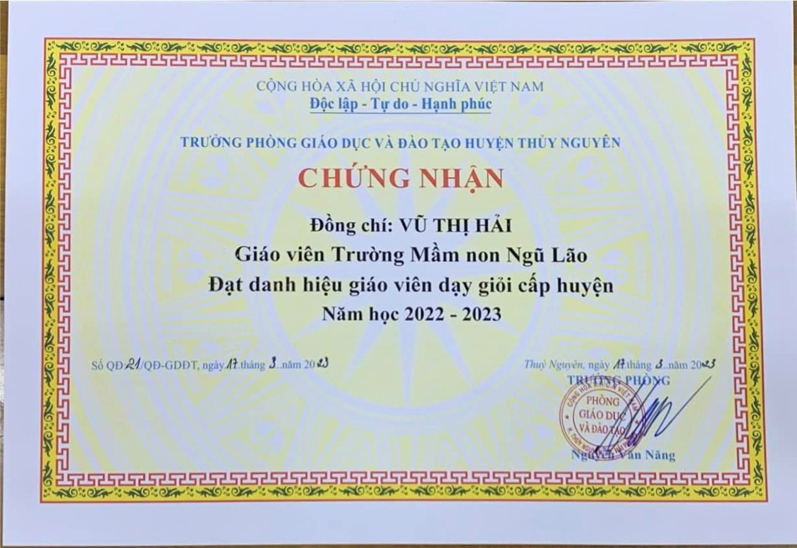 05 đồng chí trường Mầm non Ngũ Lão đã nỗ lực thành công đạt danh hiệu “Giáo viên dạy giỏi cấp Huyện” năm học 2022-2023!