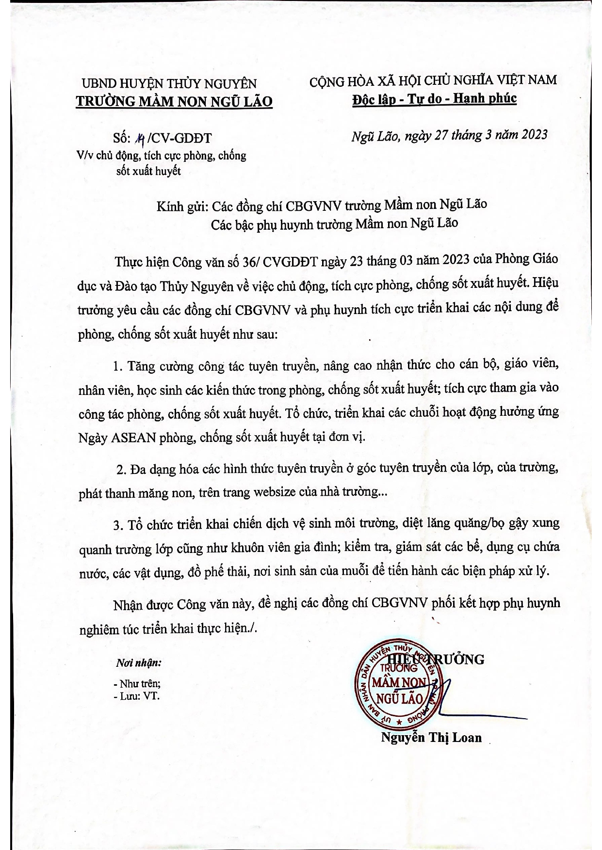 Vì sức khỏe của mỗi gia đình và của cả cộng đồng. Nhà trường kêu gọi tất cả mọi người hãy quan tâm thực hiện tốt các biện pháp phòng chống bệnh sốt xuất huyết với khẩu hiệu: “ Không có lăng quăng, không có muỗi vằn, không có sốt xuất huyết”