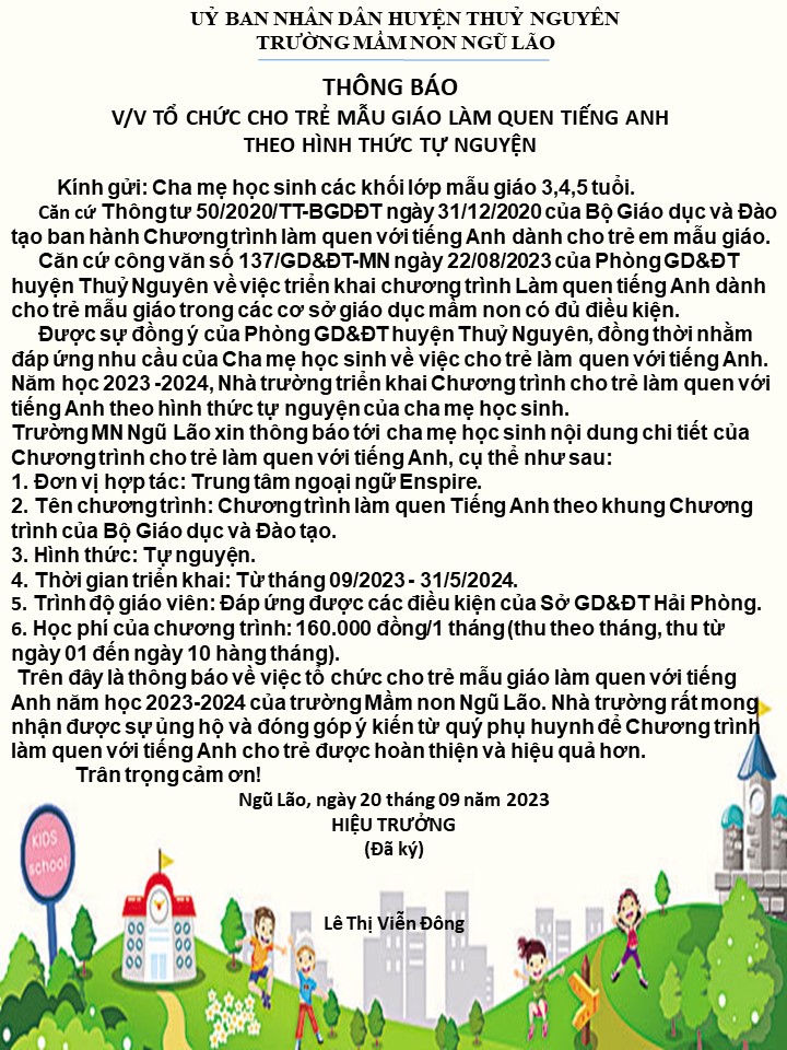 về việc tổ chức chương trình làm quen tiếng anh dành cho trẻ trong trường mầm non Ngũ Lão, năm học 2023 - 2024 của PGD&ĐT huyện Thuỷ Nguyên